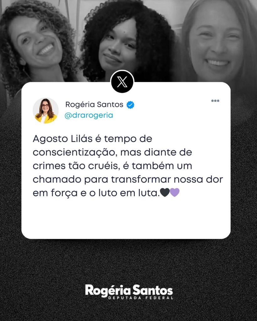 A deputada federal Rogéria Santos (Republicanos-BA) apresentou o Requerimento nº 3347/2025, no qual solicita que seja registrada nos anais da Câmara dos Deputados uma Moção de Pesar pelo trágico falecimento das professoras Alexsandra Oliveira Suzart, Maria Helena do Nascimento Bastos, e da estudante Mariana Bastos da Silva, ocorrido em Ilhéus, no sul da Bahia.
